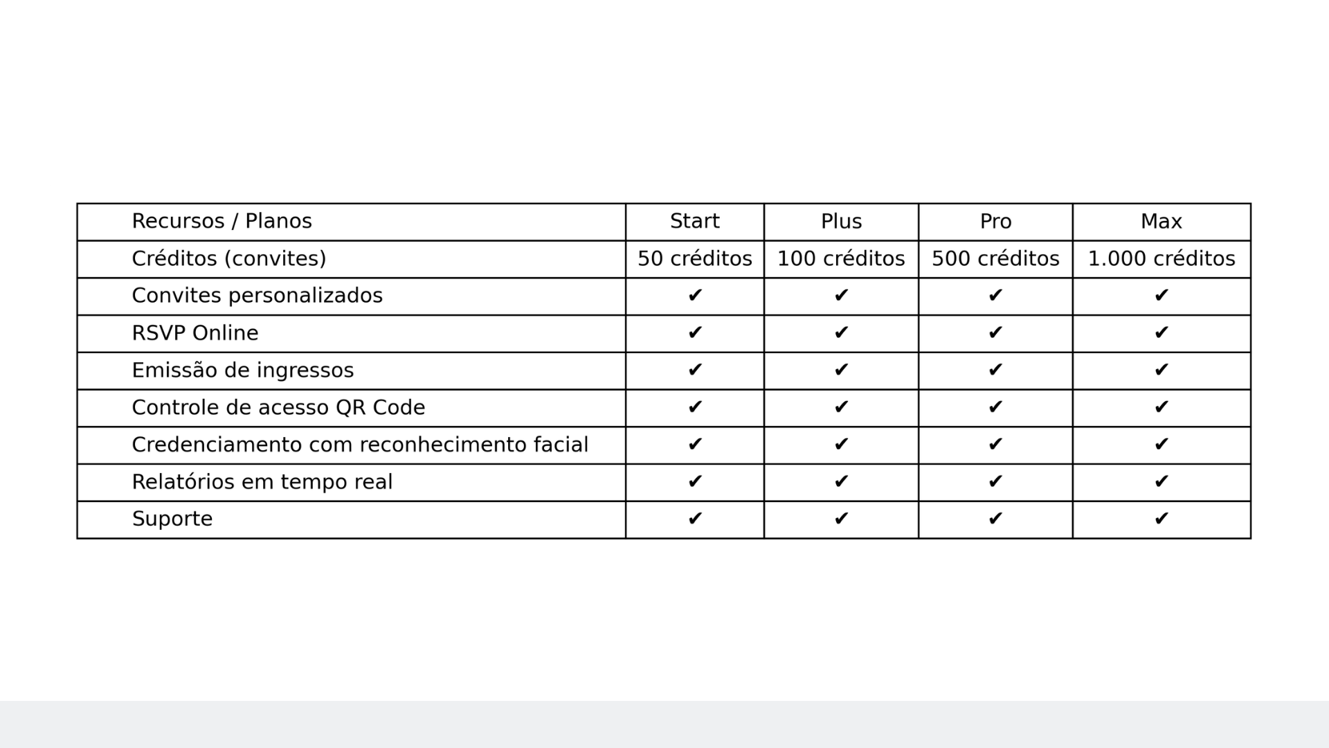 Independentemente do plano, você tem acesso a todas as funcionalidades — o que muda é a quantidade de convites (créditos).