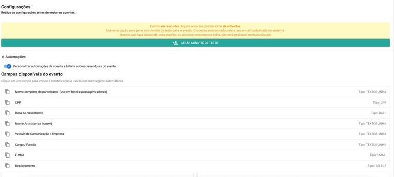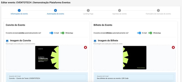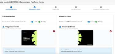 Configure o envio do convite e do bilhete com QR Code por e-mail e WhatsApp de forma simples e rápida.